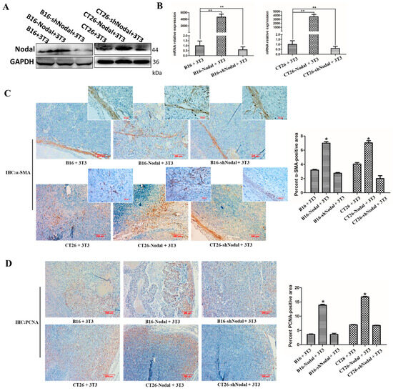 The distribution of CAFs and the expression of PCNA in the tumor tissue sections. (A) Western blotting of Nodal and TGF-β in xenograft tissues. GAPDH served as the loading control. (B) The mRNA level of Nodal in xenograft tissues was detected by real-time PCR. (C) Representative images of α-SMA-stained paraffin sections of B16 and CT26 tumor tissues were shown (×100; left) and quantitatively analyzed by ImageJ (right). The figures in the top right corner were enlarged (×400). (D) Representative images of PCNA staining in paraffin sections were shown (×100; left) and quantitatively analyzed by ImageJ (right). * p < 0.05, ** p < 0.01.