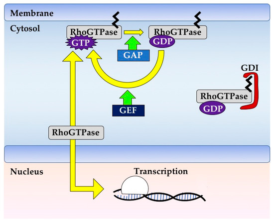 Most Rho GTPases act as molecular switches and carry out their functions by hydrolyzing GTP to GDP within the cell cytoplasm (Figure 1). Each Rho GTPase is regulated by specific Rho GTPase Activating Proteins (GAPs) which stimulate the hydrolysis of GTP, Rho Guanine-nucleotide Exchange Factors (GEFs) that promote the exchange of GDP for GTP, and Rho Guanosine-nucleotide Dissociation Inhibitors (GDIs) which sequester GDP-bound Rho away from its typical active subcellular localization at membranes and inhibit its reactivation [8] (Figure 1).