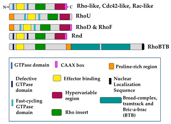 Rho GTPases share conserved structural domains. The essential building blocks of any Rho GTPase are the Rho insert and the GTPase domains. Additionally, Rho GTPases contain effector binding domains and most of them contain C-terminal CAAX domains which can be posttranslationally modified, usually by prenylation. “Classical” Rho GTPases include those of the Rho-like, Rac-like, and Cdc42-like subgroups, as well as RhoU and RhoV, and RhoD and RhoF. RhoU, RhoD, and RhoF deviate from the “classical” formula in that they contain a proline-rich domain at the N-terminus that facilitates binding to other proteins. Additionally, these proteins are considered fast-cycling GTPases, so they are in effect constitutively bound to GTP. Members of the Rnd and RhoBTB subgroups are unable to hydrolyze GTP. Additionally, RhoBTB proteins contain two BTB domains as well as putative nuclear localization sequences.