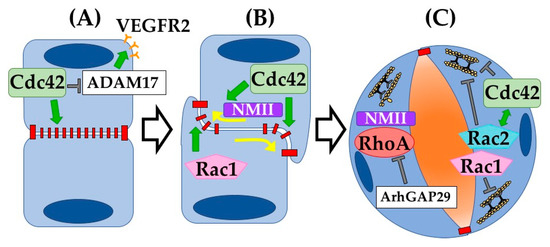 Rho GTPases drive vasculogenesis. Rho GTPases have been shown to be involved in multiple steps during vascular lumenogenesis. (A) Cdc42 has been shown to be critical in regulating cytoskeletal organization underlying EC–EC adherens junction assembly. In addition, Cdc42 normally suppresses ADAM17-mediated VEGFR2 shedding. (B) Following angioblast cell–cell adhesion, the apical membrane becomes cleared of adherens and tight junctions via Cdc42 activation of NMII-actin contractility. Rac1 functions to build vascular lumens via support of intracellular membrane transport (vacuoles). (C) Once the apical membrane forms and the lumen opens, internal contractility of ECs must relax. Our group showed that Arhgap29 suppresses RhoA, and NMII activity, thereby allowing maturing ECs to flatten as the lumen widens. Loss of Arhgap29 or increase in RhoA-NMII activity results in rounding of ECs and narrowing of vessel diameters. Rac1 and Rac2 similarly inhibit EC internal contractility, an essential step towards vascular lumen expansion.