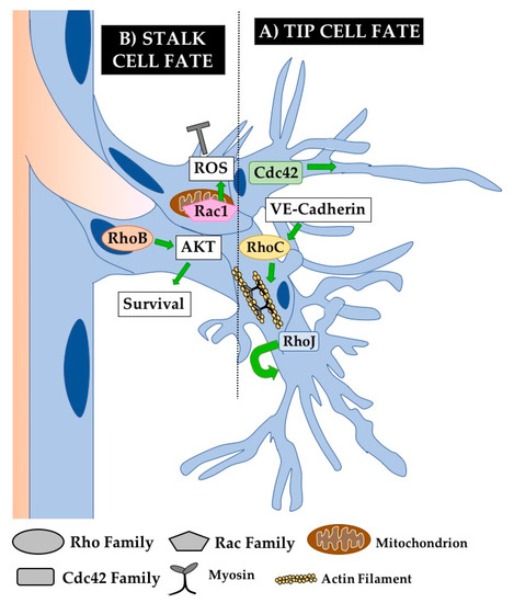 Rho GTPases regulate angiogenesis. Angiogenesis occurs via the formation of sprouts that bud off of pre-existing vessels. Basic components of an angiogenic sprout are the tip cells that explore and follow stimulatory gradients (e.g., VEGF) and the stalk cells that support sprout elongation and lumen extension. (A) Cdc42 critically regulates cytoskeletal organization in tip cells to promote the formation of functionally important filopodia. RhoJ also plays an important role in tip cell biology by regulating tip cell selection. (B) RhoB is known to regulate stalk cell survival by regulating AKT signaling from the nucleus. Meanwhile, Rac1 regulates the production of reactive oxygen species (ROS) from its unique localization in the mitochondria of stalk cells, inhibiting stalk cell fate. RhoC also plays an important role in regulating actomyosin contractility required for angiogenesis. Not shown are Rho GTPases known to play an important role in angiogenesis but without a defined cellular mechanism, including RhoA and Rac2.
