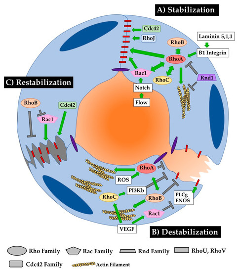 RhoGTPases regulate EC barrier establishment, breakdown and restoration. Close maintenance of blood vessel permeability is critical for the mature function of healthy blood vessels. RhoGTPases play a critical role in stabilizing, destabilizing, and restabilizing the cell–cell connections that dictate vessel barrier function. (A) RhoA seems to be the central regulator of stabilizing cell–cell junctions. Several other RhoGTPases, including RhoB, RhoC, Rac1 and Rnd1 modulate barrier function through or with RhoA. RhoJ and Cdc42 also play important roles in stabilizing junctions, as their loss in ECs reduces barrier function. (B) The pathways mediating barrier disruption are less streamlined, with RhoA, RhoB, RhoC and Rac1 all playing relatively independent roles in junction disruption. (C) Less is known about mechanisms governing barrier recovery, as experimenters do not often carefully distinguish between pathways mediating recovery or proteins that are responding to destabilization of junctions. RhoB inhibits destabilization both by directly targeting junctions and by inhibiting the stabilizing activity of Rac1. Cdc42 also contributes to stabilizing cell–cell contacts after disruption.