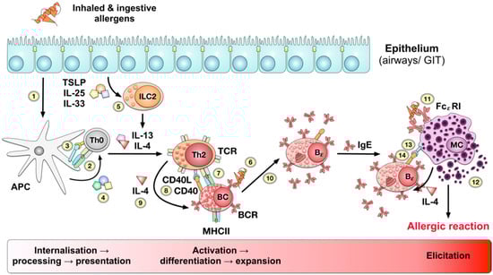 Pathomechanism of type I allergy. Uptake or penetration of allergen molecules via the respiratory or gastrointestinal epithelia (1) results in uptake, processing and presentation of allergen-derived peptides by antigen presenting cells (APCs, (2)). Activated APCs express co-stimulatory signals (3) and secrete cytokines (4) that promote the differentiation of naïve antigen-specific T cells into effector cells. In case of allergic reactions naive allergen-specific Th0 cells differentiate into Th2 cells orchestrated by the cytokines IL-13 and IL-4 produced by innate like lymphocytes type II (ILC2). The respective ILC2s are in turn activated by the cytokines thymic stromal lymphopoietin (TSLP), IL-25, and IL-33 secreted by either stressed or damaged epithelial cells (5). The activated allergen-specific Th2 cells in turn activate allergen-specific naïve B cells that have specifically recognized the allergen via their B cell receptor (BCR, (6)), taken up, processed, and presented the allergen to the T cell receptor (TCR) of the activated Th2 cell (7). The Th2 cell subsequently authorizes the activation and differentiation of the allergen-specific B cell via CD40 and CD40 ligand (CD40L) signaling (8) and secretion of the Th2-promoting cytokine IL-4 (9). Together, these signals allow for the differentiation of the allergen-specific B cell into an IgE-producing plasma cell (10). The allergen-specific IgE antibodies produced in turn by the activated plasma cell bind to the high affinity IgE receptor FcεRI on the surface of mast cells, resulting in the sensitization of these cells (11). Upon second contact with the allergen the allergic reaction is triggered by the cross-linking of the surface bound IgE antibodies resulting in the degranulation of the mast cell associated with the release of large amounts of pro-inflammatory mediators (12). The activated mast cells in a positive feedback loop drive further activation of allergen-specific B cells by the production of IL-4 and providing CD40L-mediated co-stimulatory signals (13) to CD40 on the B cell surface (14).