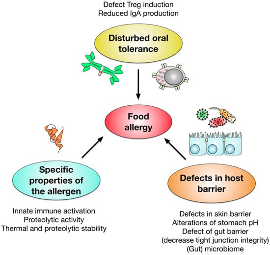 Factors contributing to the development of food allergy. The published literature suggests, that both a disruption of regulatory T cell (Treg)- and immune globulin A (IgA)-mediated oral tolerance and defects in the barrier function of skin and gut contribute to the development of food allergy. Moreover, alterations in stomach pH and the gut and skin microbiome were shown to influence allergic sensitization. In addition, intrinsic properties of the allergen molecules such as innate immune activation, proteolytic activity, or increased thermal and proteolytic stability contribute to allergic sensitization.
