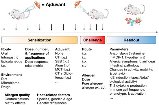 The biggest variations among the published mouse models can be found in the sensitization phase. Here, the chosen route of application, dose, number, and frequency of applications, as well as the choice of adjuvant, can critically influence sensitization success. Although every allergen behaves differently, in general, lower allergen amounts were repeatedly shown to have a higher sensitizing potential than corresponding higher allergen doses []. Moreover, the oral route of sensitization should be preferred if the effects of digestion and the interaction of the allergens with the epithelia are to be simulated [].