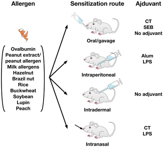 The published mouse models describe several different allergens, that are either given orally using cholera toxin, staphylococcus enterotoxin B, or without adjuvant, intraperitoneally with LPS or aluminum hydroxide, transdermally without adjuvant, or intranasally using cholera toxin or LPS as adjuvants (see Figure 4).
