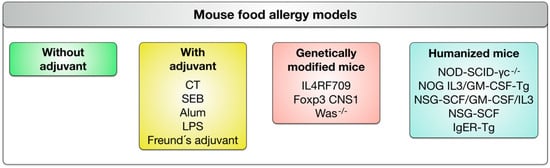 The field of mouse food allergy models has made great progress in recent decades. Studies have shown that rodents can be sensitized to food allergens either with or without the use of additional adjuvants, resulting in allergic responses upon re-exposure to the respective allergens that reflect allergic responses observed in human patients []. Although not as commonly used as mice, other animal models not covered in this review like guinea pig, rat, or neonatal swine might prove useful for certain research applications, as they reflect different aspects of allergic diseases than mice; e.g., piglets are outbred, thus might be better situated simulating genetic diversity as inbred mice strains [,,,].
