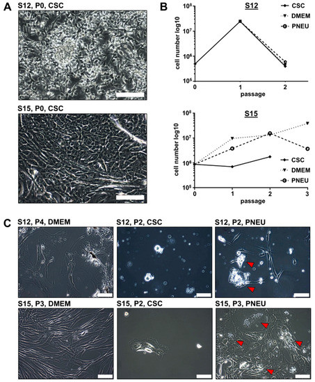 In order to better facilitate the expansion of epithelial tumor cells, we tested two distinct serum-free media. The first was DMEM-F12 medium supplemented with EGF and bFGF, adapted from previous studies [28,34], and further referred as cancer stem cell medium (CSC-medium). The second was Pneumacult Ex Plus basal medium, which was originally designed to support growth of airway epithelial cells, and hereafter will be referred as PNEU-medium. Out of six tumor samples (S12-S15, S17, and S18) that were purified and initially cultured in CSC-medium, four showed survival of epithelial tumor cells (66.7%; S12, S15, S17, and S18, Table S1). However in two of these four cases, epithelial cells only attached to the culture dish without detectable expansion (S17 and S18). Only two samples (33.3%; S12 and S15) showed striking proliferation in CSC-medium in P0 and were initially passaged after eight (S12) and 17 days (S15). In contrast, five out of seven samples (71.4%) successfully attached to the culture dish and formed expandable epithelial cell cultures in PNEU-medium. To study the differences in the proliferation and marker expression, S12 and S15 cells were cultured in parallel in 10% FBS-containing DMEM, serum-free CSC-medium, and serum-free PNEU-medium.
