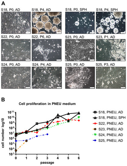 Serum-free cultures of both patients initially showed adherent growth of epithelial tumor cells in passage 0 (Figure 2A). However for S12, we observed strong proliferation until passage 1, which stopped in passage 2 for all three different media (Figure 2B). For S15, a strong increase in cell number was measured until passage 2 in PNEU and DMEM-medium, whereas cells showed poor expansion in CSC-medium. In passage 3 the overall cell numbers decreased (Figure 2B), except in DMEM. However in DMEM, S15-derived epithelial cells frequently acquired the above-described cornification-like phenotype and were overgrown by cells displaying CAF-like morphology (Figure 2C). As PNEU-medium appeared to be more suitable for the expansion of primary epithelial HNSCC cells than CSC-medium, all further serum-free cell culture experiments were performed in PNEU-medium. In contrast to S12 and S15, cells of S18 behaved strikingly different in culture. In DMEM-medium containing 10% FBS, no expansion of any cell type of S18 was observed. Only individual fibroblast-like cells attached but showed no signs of proliferation (Figure S1). In PNEU-medium, epithelial cells grew as an adherent monolayer (S18-AD) until passage 3 (Figure 3A). Besides the adherent monolayer, spheroids formed in the supernatant (S18-SPH) without the use of ultra-low attachment plates. From passage 4 on, the adherent S18 cells did not re-attach and also turned into a spheroid culture, which was visually indistinguishable from the spheroids that grew since passage 0. Cells derived from S22, S23, S24, and S25 grew as a monolayer of epithelial cells and not as spheroids, despite being processed in the same way as S18 (Figure 3A). S18-AD and S18-SPH cultures in PNEU-medium grew exponentially (Figure 3B). Cells of S22 stopped growing in passage 6 and displayed expansion of fibroblast-like cells. Cells of S23 displayed the same phenotype in passage 1 and were thus not cultured further. In contrast to that, cells derived from S24 grew exponentially for the first six passages. S25 cells proliferated continuously but were not followed beyond passage 3, as S25 was derived from a squamous cell carcinoma of the outer ear skin and thus represented a different tumor entity than S12, S15, S22, S23, and S24, which were established from mucosal HNSCCs (Table S1). Interestingly, tumor samples S12, S15, and S24 were identified to be p16-positive in histopathology (Table S1), which in clinical practice serves as a surrogate marker for HPV infection.