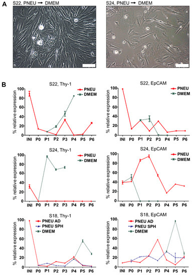 When S22 and S24 cells were split from PNEU-medium into DMEM containing 10% FBS, epithelial cells disappeared and fibroblast-like cell types expanded and replaced the epithelial population upon further passaging (Figure 4A). This was accompanied by a loss of EpCAM expression and a strong increase in Thy-1 over six passages (Figure 4B). This shows that even in established cell cultures residual stromal cells were able to overgrow epithelial cell populations in classical serum-containing culture conditions.