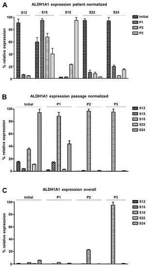 When the expression values were normalized by each patient individually, we observed much higher ALDH1A1 expression for samples S12, S22, and S24 in the original tumor than in cell culture (Figure 5A). For S12, S22, and S24, expression gradually decreased over the passages. For S15, ALDH1A1 expression was comparable in culture and in the original tumor. In contrast, for adherent S18 cell cultures, ALDH1A1 expression gradually increased until passage 3 by about 42 times.
