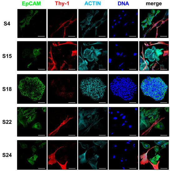 EpCAM and Thy-1 expression in mixed cell cultures composed of epithelial and mesenchymal populations visualized by indirect immunofluorescence. Cells with epithelial morphology stained highly positive for EpCAM, whereas cells with fibroblast-like morphology display high expression of Thy-1. Both markers are mutually exclusive in cell cultures derived from patients S4, S15, and S24. EpCAM positive cells of S18 and S22 showed weak Thy-1 cell membrane localization. Actin was stained using phalloidin to visualize cell morphology; DNA was stained using Hoechst33342; scale bars: 50 µm.