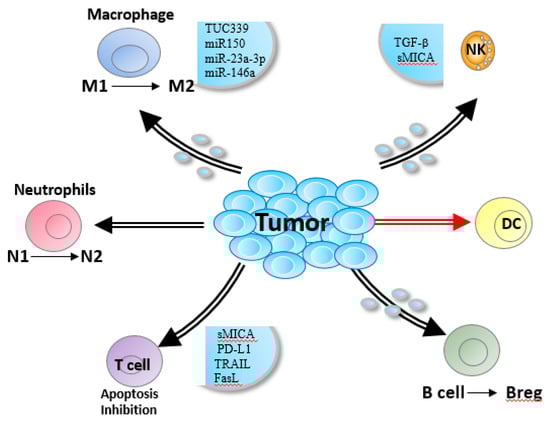 - Ning, Y.; Shen, K.; Wu, Q.; Sun, X.; Bai, Y.; Xie, Y.; Pan, J.; Qi, C. Tumor exosomes block dendritic cells maturation to decrease the T-cell immune response. Immunol. Lett. 2018, 199, 36–43. [Google Scholar] [CrossRef]