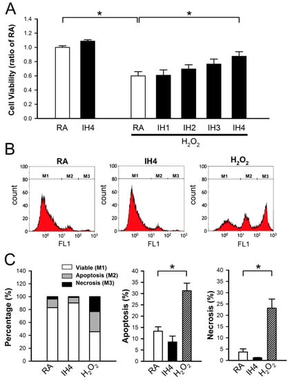 It has been demonstrated that pathogenic or beneficial effects of IH depend on hypoxic oxygen concentration, hypoxia duration, number of cycles, and IH pattern [22]. Initially, we examined whether IH can prevent cell death. Cardiomyocytes were treated with IH for 1–4 days, followed by 30 μM H2O2 treatment for 40 min, and then the cell viability was measured using the MTT assay. As shown in Figure 1A, the viability of cells treated with four days IH (IH4) was not significantly different from the viability of those treated with RA. However, treatment with IH for 1–4 days time-dependently attenuated the H2O2-induced cell death. Furthermore, cytometric analysis for Annexin V-FITC and SYTOX green revealed that the percentage of apoptotic and necrotic cells was not significantly different between the RA-treated group and the IH4-treated group. In this study, the H2O2-treated group was used to serve as a positive control for the occurrence of apoptosis and necrosis (Figure 1B,C).