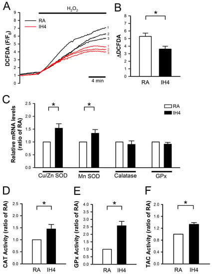 Previously, we demonstrated that IH can protect cardiomyocytes against the H2O2-induced cell death [21]. Here, we further investigated whether IH can enhance the antioxidant defense capacity to against oxidative stress. To address this issue, the cells were treated with IH for four days, followed by perfusion with 30 μM H2O2 to increase the intracellular ROS level, which was detected by fluorescence probe, DCFDA, and the signals were detected by a real-time fluorescence imaging system (Figure 2A). In the RA-treated group, H2O2 treatment increased the level of intracellular ROS approximately 5-fold compared with the baseline. IH4 significantly attenuated the H2O2-induced increases of the intracellular ROS levels (Figure 2B). Next, we examined the mRNA expression levels of antioxidant enzymes by Q-PCR. As shown in Figure 2C, IH4 significantly increased the mRNA levels of Cu/Zn SOD and MnSOD. However, the mRNA levels of catalase and GPx did not change significantly. We further measured the activity of catalase, GPx and TAC using assay kit. The activities of catalase (Figure 2D), GPx (Figure 2E), and TAC (Figure 2F) were significantly higher in the IH4-treated group than the RA-treated group. These data suggest that treatment with IH for four days increased the endogenous antioxidant defense capacity.