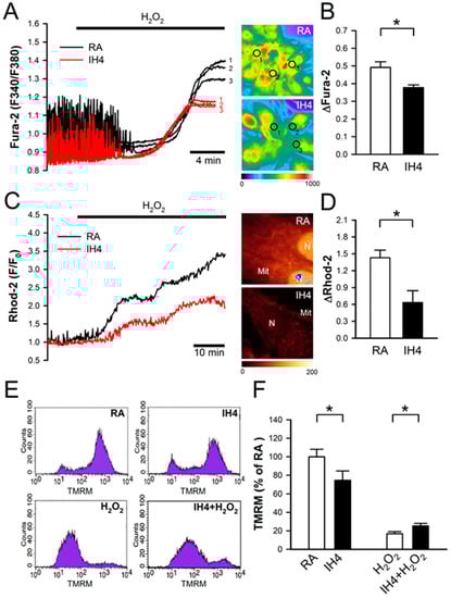 Previous studies have suggested that oxidative stress induces intracellular Ca2+ overload, which in turn causes mitochondrial membrane depolarization, hence leading cell death [23,24]. To test whether IH can prevent oxidative stress-mediated accumulation of intracellular Ca2+, the cardiomyocytes were treated with IH for four days followed by 30 μM H2O2 treatment to increase the intracellular ROS level, and then subjected to the intracellular Ca2+ concentration detection in the IH- and RA-treated cells by fluorescence probe, Fura-2. Our data show that IH4 significantly attenuated the H2O2-induced increases of the intracellular Ca2+ levels (Figure 3A,B). Using fluorescence probe, Rhod-2, we further demonstrated that IH4 significantly attenuated the H2O2-induced increases of the mitochondrial Ca2+ levels (Figure 3C,D). It has been suggested that excessive ROS can open mitochondrial permeability transition pore, hence leading mitochondrial membrane depolarization [24]. We further examined whether IH can prevent oxidative stress-mediated mitochondrial membrane depolarization. The change of mitochondrial membrane potential was evaluated by flow cytometry analysis using a fluorescence probe, TMRM, which is a cell-permeant dye that accumulates in healthy mitochondria and can be detected a strong signal. When the mitochondrial membrane depolarizes, TMRM was released from the mitochondria and weak signal was detected. We measured the average of TMRM fluorescence intensity of 10,000 cells per well. The average of TMRM in the RA group was as 100% (Figure 3E). As illustrated in Figure 3F, the TMRM signals in the IH-treated group were significantly lower than in the RA group. Under H2O2 treatment conditions, however, the IH4-treated group showed significantly higher TMRM signals than the RA group. These data demonstrate that treatment of cardiomyocytes with IH for four days significantly attenuated the H2O2-induced intracellular Ca2+ overload and mitochondrial membrane depolarization.
