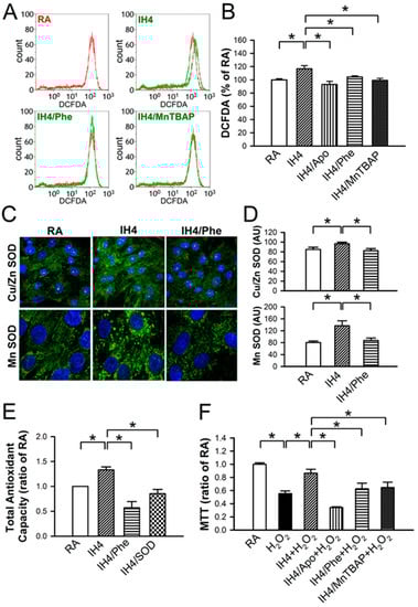 It has been suggested that ROS can serve as a mediator to trigger signaling pathways involved in regulating cardioprotective effects [20,21]. Flow cytometry analysis demonstrated that IH4 significantly increased the intracellular ROS generation. However, treatment of cardiomyocytes with an antioxidant, such as Apo, Phe, or MnTBAP, abolished the IH4-increased intracellular ROS generation (Figure 4A,B). We further investigated whether IH can increase antioxidant enzyme expression. Cardiomyocytes were treated with IH for four days with or without Phe (100 nM), an antioxidant, and the expression of Cu/Zn SOD and MnSOD were detected by immunocytofluorescence staining. IH4 significantly increased the expression of Cu/Zn SOD and MnSOD. However, Phe abolished the IH4-increased Cu/Zn SOD and MnSOD expression (Figure 4C,D). We also measured the total antioxidant capacity (TAC) to clarify whether IH increased endogenous antioxidant defense system via intracellular ROS generation. The levels of TAC were significantly higher in the IH4-treated group than in the RA-treated group. However, treatment of cardiomyocytes with IH for four days with Phe (100 nM) or SOD (5 U) abolished the IH4-increased TAC (Figure 4E). To investigate whether ROS was a key mediator contributing to the IH-induced cardioprotective effects, cardiomyocytes were pre-treated for four days with IH and Apo (100 μM), Phe (100 μM), or MnTBAP (50 μM) together to prevent ROS generation, followed by 30 μM H2O2 treatment for 40 min, and then subjected to measure the cell viability by MTT assay. As shown in Figure 4F, treatment with IH for four days significantly attenuated the H2O2-decreased cell viability. However, treatment with IH together with an antioxidant, such as Apo, Phe, or MnTBAP, abolished the IH-protected cell death. These data suggest that IH increased ROS generation, which upregulated antioxidant enzyme expression and increased the total antioxidant capacity, thereby preventing cell death.
