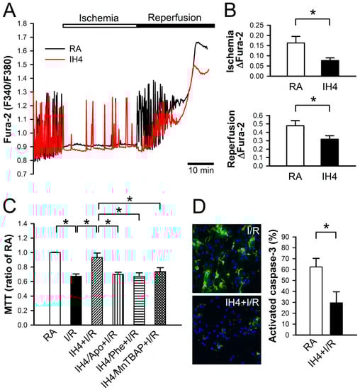 Effects of IH on the I/R-induced cytosolic Ca2+ increases and cell death. (A) The time course of cytosolic Ca2+ changes in cardiomyocytes perfused with ischemic and reperfusion buffer to mimic I/R injury, and recorded by a real-time fluorescence imaging system. Treatment of cardiomyocytes to IH for four days attenuated the ischemia and reperfusion-induced increases of cytosolic Ca2+ level. (B) The difference between the baseline and plateau of Fura-2 (F340/F380) was defined as ΔFura-2. The quantitative results show that the ischemia and reperfusion-increased cytosolic Ca2+ was significantly lower in cardiomyocytes treated with IH4 than with RA. Data represent the means ± SEM. n = 4 for each group. * p < 0.05. (C) Neonatal cardiomyocytes were treated with IH for four days, and then co-treated with IH and antioxidant, Apo, Phe or MnTBAP, followed by I/R treatment. Treatment with IH4 prevented the I/R-induced cell death. However, co-treatment with Apo, Phe or MnTBAP abolished the IH-prevented cell death. Data represent the means ± SEM. n = 5 for each group. * p < 0.05. (D) The left panel shows the representative images of activated caspase-3 expression detected by CaspGLOW fluorescein active caspase-3 staining kit after I/R treatment. The right panel gives the quantitative results, showing that the expression of active caspase-3 was significantly lower in cardiomyocytes treated with I/R + IH4 than with I/R + RA. Data represent the means ± SEM. (n = 14). * p < 0.05. I/R, ischemia/reperfusion.