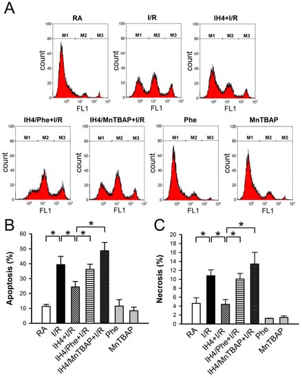 We previously demonstrated that Ca2+ overload plays an important role in the I/R-induced cell death [25]. In Figure 3, we demonstrated that IH4 significantly attenuated the H2O2-induced cytosolic Ca2+ overload. We further investigated whether IH could also prevent the I/R-induced cytosolic Ca2+ overload and cell death. After treatment with IH for four days, cardiomyocytes were placed in a plexiglass box chamber containing 100% N2, perfused with 100% N2-saturated ischemia buffer for 30 min, and followed by reperfusion for 30 min with 100% O2-saturated NT solution. Fluorescence probe, Fura-2, was used to detect the changes of Ca2+ during I/R. Our results show that IH4 significantly attenuated the I/R-induced increases of the cytosolic Ca2+ levels (Figure 5A,B). Moreover, treatment with IH for four days also significantly attenuated the I/R-decreased cell viability. However, treatment with IH for four days in the presence of an antioxidant, Apo, Phe or MnTBAP, abolished the IH-prevented cell death (Figure 5C). We also detected the level of cleaved caspase-3 to analyze apoptosis status in cardiomyocytes. As shown in Figure 5D, IH4 significantly decreased the I/R-induced apoptosis. Finally, flow cytometry analysis was conducted to measure the percentage of live cells (M1), apoptotic cells (M2) and necrotic cells (M3) in cardiomyocytes (Figure 6A). I/R increased the occurrence of apoptosis (Figure 6B) and necrosis (Figure 6C), and this effect was significantly attenuated by IH4 treatment. However, the IH-prevented apoptosis were abolished by co-treatment with Phe or MnTBAP. IH4 also significantly attenuated the I/R-induced necrosis. Noticeably, treatment with Phe or MnTBAP alone did not induce apoptosis or necrosis. These data suggest that IH prevented the I/R-induced cytosolic Ca2+ overload and cell death via ROS generation.