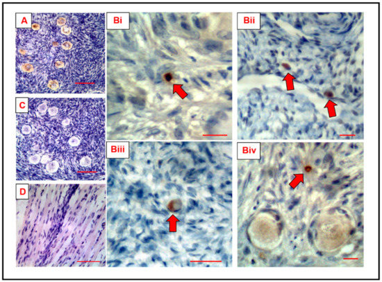 - Zhang, D.; Fouad, H.; Zoma, W.D.; Salama, S.A.; Wentz, M.J.; Al-Hendy, A. Expression of stem and germ cell markers within nonfollicle structures in adult mouse ovary. Rep. Sci. 2008, 15, 139–146. [Google Scholar] [CrossRef]