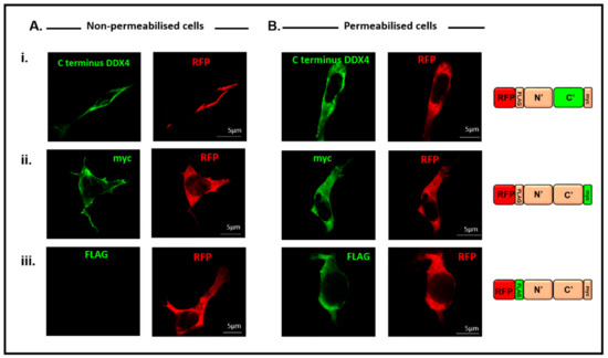 HEK 293T cells were transfected with the pFLAG-DDX4-myc construct and both non-permeabilised (Figure 3A) and permeabilised (Figure 3B) cells were immunostained with antibodies against (i) the C-terminus of DDX4, (ii) the myc tag or (iii) the FLAG tag. RFP was detected in all cells to confirm successful transfection. Figure 3Ai illustrates that the C-terminus of DDX4 is extracellular, as cell surface fluorescence was observed, in non-permeabilised cells, when using an antibody against the C-terminus of DDX4. The same fluorescent pattern was shown by immunostaining with the myc antibody (Figure 3Aii). Fluorescence was not detected in the majority of non-permeabilised transfected cells immunostained with the FLAG antibody (Figure 3Aiii), confirming that the N-terminus of DDX4 is intracellular in these cells. However, 3.5% ± 0.9% of transfected cells did show weak membrane staining of the N-terminus of DDX4 (Figure S4).