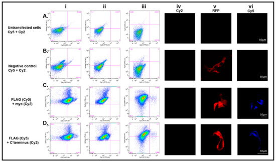 The negative controls using transfected HEK 293T cells also showed no non-specific binding of Cy5 or Cy2 secondary antibodies alone (Figure 6Bi-ii, respectively) or together (Figure 6Biii). 21.7% (Figure 6Bi) and 28.6% (Figure 6Bii) were DsRed-positive, but 98.7% of cells were negative for both Cy5 and Cy2 (Figure 6Biii). This was confirmed by immunofluorescent studies (Figure 6Biv–vi).
