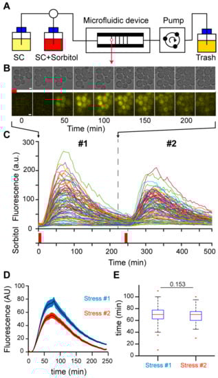 A population of growing yeast cells in a microfluidic device was submitted to short, repeated hyperosmotic stresses using 1 M sorbitol (Figure 1A). To measure the response to hyperosmotic stress, we created a reporter of HOG pathway activity by tagging the pSTL1 promoter with the fluorescent protein yECITRINE (yEFP) to enable quantification of fluorescence at the single-cell level as a function of time [28] (Figure 1B). Individual cells could be tracked during the time course of an experiment, allowing us to quantify the activation of pSTL1 in response to the first and second osmotic stresses due to the short, transient activation of the HOG pathway (Figure 1C). The limited duration of the stress (8 min) and the long delay between the first and second stress (4 h) guaranteed (i) investigation of the genetic response to hyperosmotic stress before adaptation was established 15–30 min after stress [29], and (ii) full recovery of the cells from the first stress as further evidenced by the similar division time after the first and the second stress (not shown), thus allowing us to compare the dynamics of the responses to the first and second osmotic stresses. Moreover, daughter cells born between the two stresses were not considered, as they were not exposed to the first stress and may blur the stress response. We focused exclusively on the population that received both the first and second stresses (Figure 1C). For this population, we calculated the mean fluorescence peaks reached during the first and second stresses, taking the basal fluorescence levels prior to the corresponding stress as a reference. Peak fluorescence reached 77.14 ± 6.71 (a.u.) after the first stress and 55.44 ± 4.26 (a.u.) after the second stress, indicating an average decrease in fluorescence intensity of 20% after the second stress (Figure 1D). The time required to reach peak fluorescence was not different for the first and second stresses (Figure 1E). The decrease in peak fluorescence amplitude between the first and second stresses correlated with a decrease in yEFP protein expression, as detected by Western blotting (Figure S1), suggesting the changes in peak fluorescence were not related to photo-bleaching.