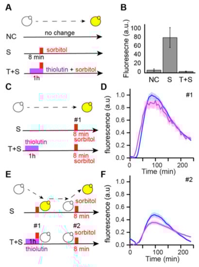 In order to investigate the biological origin of the memory effect, we first determined if the memory effect was linked to the synthesis of one or more long-lived proteins during the first episode of stress. To test this hypothesis, we inhibited transcription during stress using thiolutin, a well-studied antibiotic that inhibits all three yeast RNA polymerases in a reversible manner [32] (Figure 3A,B). As expected, treatment with thiolutin led to the loss of pSTL1 activation in response to stress: none of the cells treated for 1 h with thiolutin (50 µg/µL), and then subjected to 8 min hyperosmotic stress showed a fluorescent signal whereas 80 ± 20% of cells exhibited a fluorescent signal in response to hyperosmotic stress in the absence of thiolutin (Figure 3A,B). Next, we examined the ability of the cells to respond to hyperosmotic stress after treatment with thiolutin (Figure 3C,D). After 1 h thiolutin treatment, the inhibitor was washed out for 4 h and then the cells were exposed to 8 min hyperosmotic stress. At the population level, a similar response was observed compared to the first stress response in the absence of thiolutin treatment (Figure 3C,D). However, pretreatment with thiolutin slightly reduced the magnitude of the stress response. The maximum intensity after 8 min of stress was 88, 55 ± 7.7% for thiolutin-pretreated cells compared to 100 ± 4.74% for non-treated cells, suggesting that the effect of thiolutin was not completely erased. We then treated cells with thiolutin for 1 h, including the time period of the first stress, washed the inhibitor out for 4 h and then submitted the cells to a second 8 min stress (Figure 3E,F). Under these conditions, thiolutin-pretreated cells showed a marked decrease of 40% in the YFP signal intensity of the second stress response, which is comparable to the 47% decrease in the response to the second stress in cells without thiolutin treatment.