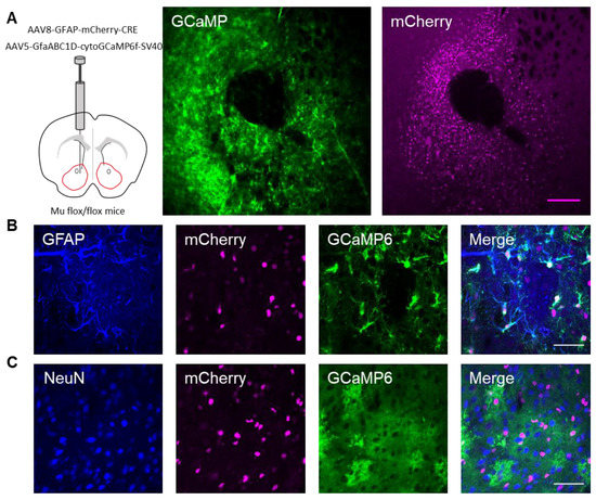 Targeting AAV8–GFAP–mCherry–CRE to astrocytes in the nucleus accumbens of μ-flox mice. (A) Scheme of viral targeting experimental approach and immunohistochemistry images of GCaMP6 (green) and AAV8–GFAP–mCherry–CRE (magenta) in the nucleus accumbens. (B) Immunohistochemistry images of mCherry+ cells co-stained with GFAP and GCaMP6, and the merge image in the nucleus accumbens. (C) Immunohistochemistry images of mCherry+ cells co-stained with NeuN and GCaMP6, and the merge image in the nucleus accumbens. Magenta scale bar = 200 μm, white scale bar = 50 μm.
