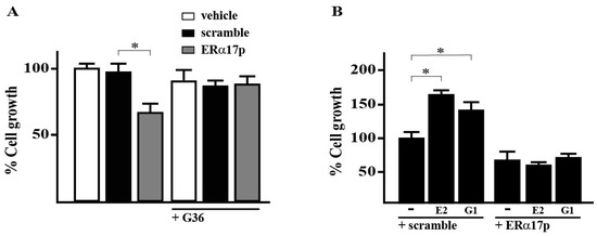 Next, we tested the anti-proliferative action of ERα17p in the presence of the GPER antagonist G-36, [50], the GPER agonists G-1 [51] and E2 [52], each at a concentration of 100 nM. The antagonist G-36 decreases the anti-proliferative action of ERα17p by ~50% (Figure 1A). The cell growth percentages obtained with G-36, alone, or after a pre-incubation of 72 h with 10 μM ERα17p were identical. We also observed that ERα17p at the same concentration prevents the growth effects induced by 100 nM E2 or G-1 (Figure 1B). No effect was observed with the scramble peptide. In any case, no additive effects were observed between ERα17p and the tested GPER ligands. Importantly, a negative cell growth value can be assigned to ERα17p when referred to the GPER in the absence of ligand (normalized reference with the scramble peptide: 100%).