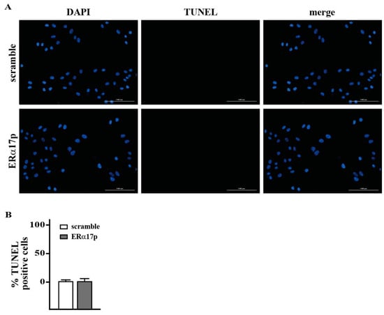 We began our study by evaluating the proliferation of SkBr3 cells in the presence of the peptide ERα17p. After 72 h of treatment with 10 μM ERα17p, we noticed a roughly 25% decrease in the growth of SkBr3 cells (Figure 1A). No effect was observed with the scramble peptide. However, TUNEL assays failed to reveal apoptosis (Figure 2A,B).