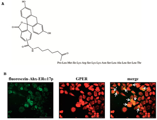 In previous studies, we have shown that the peptide ERα17p was able to associate with both artificial anionic [24] and natural [35] membranes. On the basis of these preliminary results we wished to determine if the peptide localized at the membrane of ERα−/GPER+ SkBr3. We have thus used a fluorescein-labeled version of the peptide, where an Ahx (aminohexanoic acid, Figure 3A) was introduced between the fluorescent probe and the peptide to avoid any steric interference that would compromise protein–ligand interactions and, thereby, biological response. The fluorescent peptide was active with the same potency as the parent peptide, validating our approach. Localization of the peptide at the membrane was indeed observed, confirming our previous studies (Figure 3B) [35]. Such results could be related to its weak ability to internalize in cells [24,37,70]. Importantly, the fluorescence signal of the labeled peptide was shown to co-localize with the GPER, as highlighted by a concomitant immunofluorescence stain using the specific GPER antibody TA 55,133 (Figure 3B). Hence, ERα17p membrane targeting may corroborate with a direct association of the peptide within the extracellular GPER ligand-binding site. The full-length 66 kDa ERα and its 36 kDa-truncated isoform, which both share the 295–311 sequence, associate physically with GPER [71,72,73].