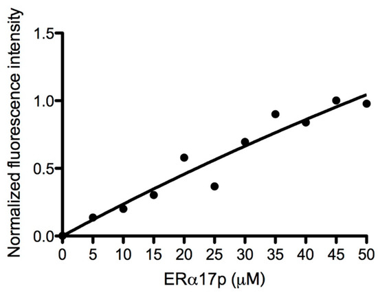 The recombinant Grb2 protein was obtained and purified following a previously published protocol [38]. The interaction of ERα17p with Grb2 SH3 domains was estimated using a fluorescence-based titration assay, which was performed at 18 °C in a 1 cm pathlength cell with stirring using a Jasco FP-6200 spectrofluorimeter (Jasco, Essex, United Kingdom). Excitation and emission wavelengths were fixed at 280 and 350 nm, respectively. A Grb2 concentration of 1 μM in 50 mM Tris buffer adjusted to pH 8.0 was initially used. Fluorescence changes were recorded upon the addition of 5 μL of a peptide solution at 10−3 M. The experimental curve was analyzed with the software Prism™ (version 5.0a, GraphPad Software, San Diego, California, USA). The experiment was performed twice.