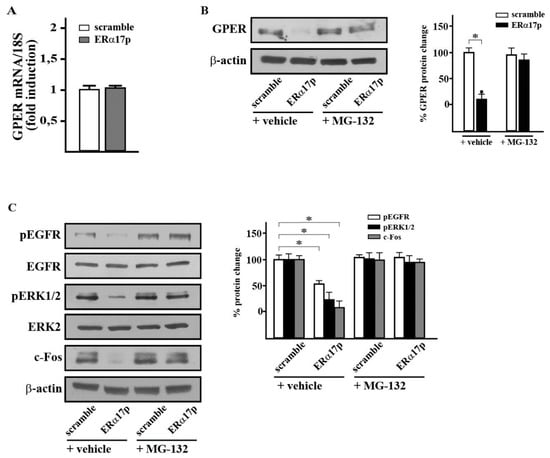 At a concentration of 10 μM and after 8 h of treatment, the peptide ERα17p drastically lowers the levels of GPER. It is noteworthy that both ERα17p and scramble peptide (10 μM) failed to decrease the level of GPER mRNA after 8 h of incubation (Figure 5A). Importantly, the proteasome inhibitor MG-132 prevents this decrease (Figure 5B). No effect was observed with the scramble peptide. ERα17p also abolishes the phosphorylation of EGFR (i.e., pEGFR) and ERK1/2 (i.e., pERK1/2), and decreases c-fos, as shown in Figure 5C (control: scramble peptide).