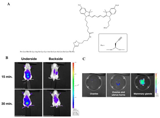 In a previous work, we have shown that the peptide ERα17p was able to reduce by ~50% the volume of subscapularis xenografted human breast tumors obtained from ERα−/GPER+ MDA-MB-231 basal B TNBC cells [79] in mice without apparently affecting the liver. Thus, a specificity of the peptide for breast tissue seems likely [35]. In the present study, we were interested in exploring the distribution of the peptide in female organs by using an ERα17p peptide labeled at the C-terminus with the bright far-red fluorescent dye Cy5 (ERα17p-Pra(Cy5), Figure 6A), which is ideal for in vivo distribution studies. We observed that ERα17p diffuses easily with typical organ distribution in mice (Figure 6B) and a modest staining of the ovaries and uterus horns (Figure 6C). Likewise, a strong tropism of the peptide for the mammary glands, where GPER is widely expressed, was confirmed (Figure 6C).