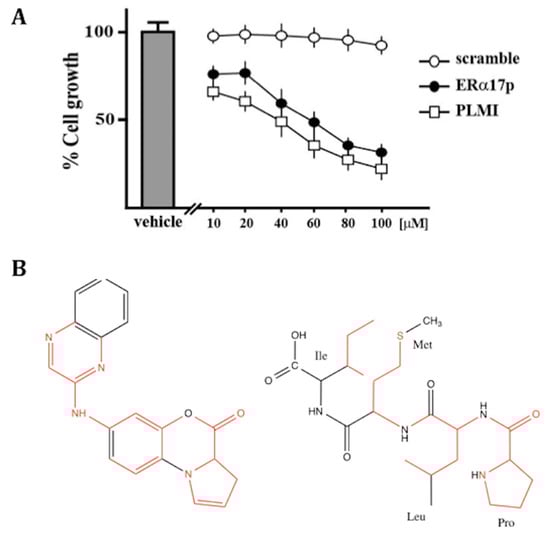 (A) The tetrapeptidic sequence PLMI inhibits the growth of breast cancer cells. SkBr3 cells were treated for 72 h with increasing concentrations of the scramble peptide (control), the ERα17p or the PLMI tetrapeptide. Cell viability is expressed as the percentage of cells upon exposure with ERα17p or PLMI with respect to cells treated with the scramble peptide (control). Values are mean ± SD of three independent experiments performed in triplicate. (B) Structural analogies (in red) between the GPR30 antagonist PBX1 (left) and the ERα17p-derived peptide motif PLMI (right).