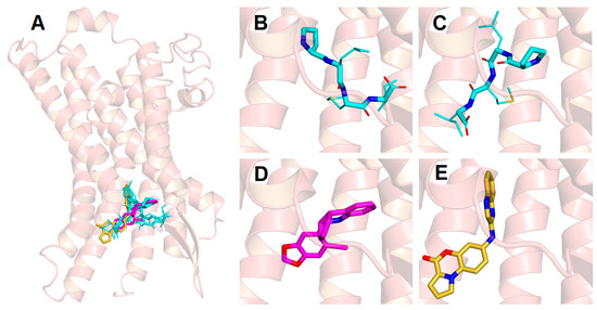 Docking and molecular dynamics (MDs) of ligands/GPER complexes. The GPER is shown as semi-transparent (ribbon), with the disordered region 1–50 omitted. Hydrogen atoms are omitted in all panels. Side chains are represented as smaller sticks compared to the backbone, with the exception of the ring of the proline that corresponds to the N-terminus. The oxygen and nitrogen atoms of the ligands are specified in red and blue, respectively. (A) Superimposition on the GPER model of the four most favorable docking structures of the tetrapeptide PLMI (cyan) and of two known GPER ligands (i.e., G-15 (magenta) and PBX1 (yellow)). (B, C) Details of the two main simulated binding modes of PLMI, with the N-terminus pointing towards the core of the GPER and with the side chain of the proline and the leucine 2 occupying alternate positions. (D, E) Binding modes of the selected compounds G-15 and PBX1, respectively.