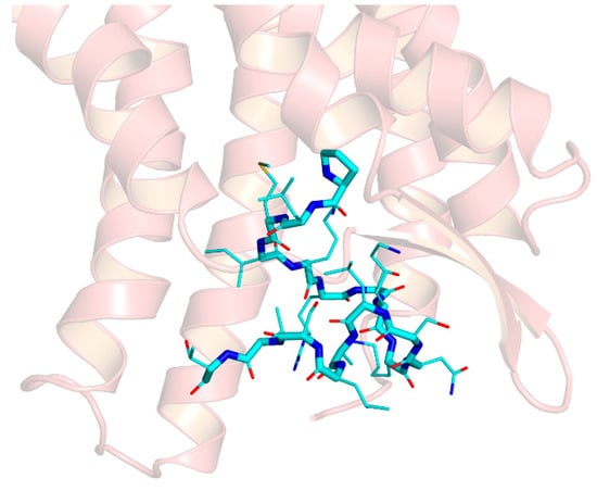 The same calculations with the full-length peptide reveal a similar association with the GPER, with a predicted Kd in the micromolar range. The contribution of the first four N-terminal residues was predominant (–5.1 kcal/mol) as the entire peptide remains attached to the GPER ligand-binding site with the N-terminal proline projected towards the receptor core. Due to a significant energy contribution by ~1–3 kcal/mol depending upon the degree of compaction of the unstructured C-terminal region of the peptide (sequence KRSKKNSLALSLT) in the entrance of the protein cavity (Figure 9), we did not attempt to make an accurate estimate of the binding affinity. This effect might depend on finer detail in the parameterization of the solvent that cannot be easily corrected, as suggested by simulations with different water models obtained from a protocol recently developed for disordered peptides and protein regions [77,78].