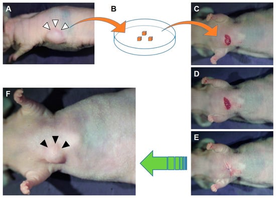 For example, procedures for the establishment of a Ewing’s sarcoma PDOX model are shown in Figure 1 [28]. The established subcutaneous tumor was cut into small fragments (Figure 1A,B). A seven mm skin incision was made on the right chest wall; then, a single tumor fragment was implanted orthotopically into the layer between the pectoral and intercostal muscles in the right chest wall of the nude mouse to establish a PDOX model (Figure 1C–E). The implanted tumor was grown in the right chest wall in the PDOX model (Figure 1F).