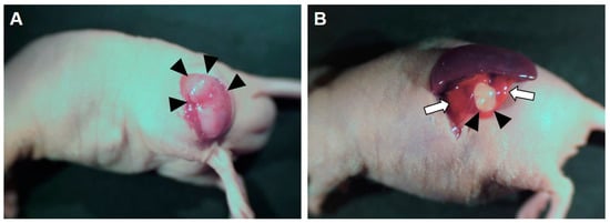 Examples of PDOX models. (A) A soft tissue sarcoma PDOX model was established by implanting a tumor into the lower extremity of a nude mouse [27]. The tumor was exposed by cutting the skin. (B) A pancreatic cancer PDOX model was established by implanting a tumor into the tail of the pancreas of a red fluorescent protein (RFP)-expressing nude mouse [24]. Black arrowheads indicate grown tumors. White arrows indicate the RFP-expressing pancreas.
