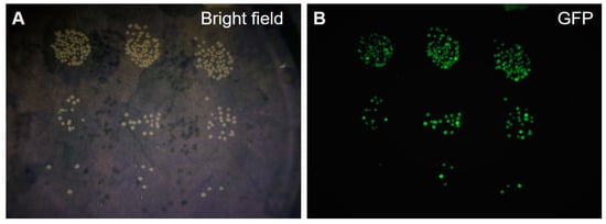 Agar culture from a tumor treated with S. typhimurium A1-R in a Ewing’s sarcoma PDOX model. Bright field (A) and fluorescence imaging (B) of cultured green fluorescent protein (GFP)-expressing S. typhimurium A1-R targeted to a Ewing’s sarcoma PDOX tumor [28].