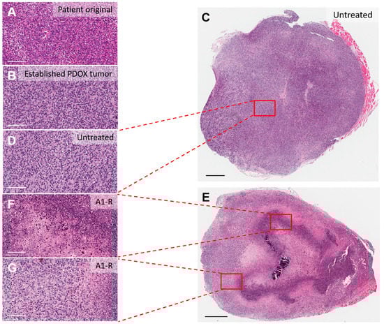 Histological findings in untreated tumors and tumors treated with S. typhimurium A1-R in the Ewing’s sarcoma PDOX model (H and E staining). (A) Ewing’s sarcoma from the original patient tumor. (B) High-magnification image of an established tumor in a Ewing’s sarcoma PDOX model. (C) Whole tumor image of untreated control tumor in a Ewing’s sarcoma PDOX model. (D) High-magnification image of (C). (E) Whole tumor image of a S. typhimurium A1-R-treated tumor in a Ewing’s sarcoma PDOX model. (F,G) High-magnification images of (E). Scale bars in (A,B,D,F,G): 100 μm; scale bars in (C,E): 500 μm.