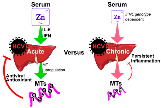 Role of zinc and metallothioneins (MTs) in acute and chronic hepatitis C virus (HCV) infections. In acute HCV infection, pro-inflammatory cytokines such as IL-6 and IFN-λ stimulate the redistribution of serum zinc into the liver. Elevated hepatic zinc stimulates the induction of MTs, which serve as potent antioxidants via their binding and release of zinc, but also display mild antiviral activity. For reasons that remain poorly defined, chronic HCV infection results in low serum and hepatic zinc. Consequently, liver MT expression is reduced, and the liver is subject to chronic inflammation due to persistent viral replication and oxidative stress. Further, chronic hepatitis C (CHC) patients with the rs12979860 CC interferon lambda (IFNL) genotype possess increased serum zinc and demonstrate improved responses to antiviral treatment, supporting the immuno-stimulatory role of zinc.