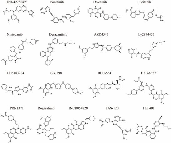 As noted above, aberrantly expressed FGFRs have been implicated in various tumors. Therefore, extensive work has been performed on the development of FGFR inhibitors. The inhibitors that are in clinical trials or approved by the FDA for clinical use are summarized in Table 1, and the chemical structures of those inhibitors are shown in Figure 3.