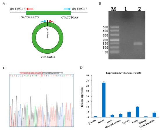 Figure 1. Expression pattern of circ-FoxO3. (A) Divergent primers used in the amplification of circular junction. (B) RT-PCR verification of circ-FoxO3 junction site by reverse splicing. M is a marker (Takara, DL500: 500 bp, 400 bp, 300 bp, 200 bp, 150 bp, 100 bp, and 50 bp), and lane 1 is a negative control. (C) Validation of circ-FoxO3 head-to-tail junction sequence using DNA sequencing. (D) Differential expression of circ-FoxO3 in seven different tissues (heart, liver, spleen, lung, kidney, stomach, small intestine, and skeletal muscle) of a mouse. Expression levels in different tissues are normalized using the β-actin gene. All groups were performed with three biological replicates and all reactions were performed in triplicate. Error bars indicate ± SD.