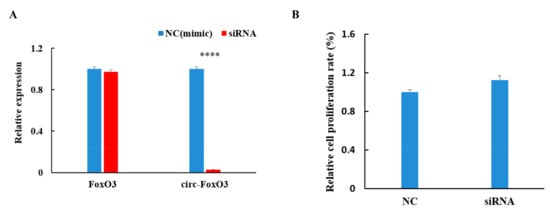 Figure 3. Effect of circ-FoxO3 on C2C12 myoblast cells proliferation. (A) Verification of interference efficiency of circ-FoXO3 by siRNA. The expression levels of FoxO3 and circ-FoxO3 are normalized using the β-actin gene. NC is a siRNA mimic, and we used NC samples (set to 1) to quantify other samples. (B) Detection of the effect of circ-FoxO3 on C2C12 myoblast cells by the MTT assay. NC is a siRNA mimic, and we used NC samples (set to 1) to quantify other samples. All groups were performed with three biological replicates and all reactions were performed in triplicate. Error bars indicate ± SD and **** p < 0.0001.