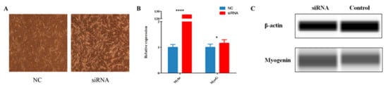 C2C12, which is an immortalized mouse myoblast cell line, was purchased from the cell bank of the Chinese Academy of Sciences. C2C12 is cultured in Dulbecco’s Modified Eagle Medium (DMEM) (Gibico, Grand Island, NY, USA) containing 10% fetal bovine serum (FBS) (Gibco, Grand Island, NY, USA) and 1% penicillin/streptomycin (Invitrogen, Carlsbad, CA, USA), and is cultured at 37 °C with a 5% CO2 humidified atmosphere. In order to induce the differentiation of C2C12, we replaced 10% FBS culture medium with 2% horse serum (HS) (Gibico, Grand Island, NY, USA) culture medium. We used liposomes 2000 (Invitrogen, Carlsbad, CA, USA) to transfect cells according to the manufacturer’s instructions. When the cell density reached about 80%, the culture medium was replaced with a Reduced Serum Medium (Gibico, Grand Island, NY, USA). After starvation treatment for 4 h, the cells were transfected with NC (siRNA mimic: 5′-UUCUCCGAACGUGUCACGUTT-3′) and siRNA (5′-GGGCAAAGCAGAACUCCAUTT-3′), respectively. After transfection for 6 h, the culture medium was changed into 10% FBS medium for subsequent experiments. NC and siRNA were synthesized by GenePharma Biotechnology (Shanghai, China).