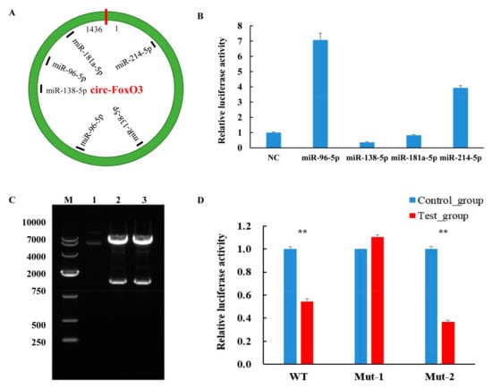 Figure 5. Interaction of circ-FoxO3 with miRNA. (A) Bioinformatics analysis predicts circ-FoxO3 potential miRNA target sites. (B) Identification of miRNA target sites of circ-FoxO3 by a dual luciferase reporter system. NC is a pcDNA3.1(+) empty plasmid, and we used NC samples (set to 1) to quantify other samples. (C) Double restriction enzyme digestion of a recombinant vector with miR-138-5p target site mutation. Lane 1 is a control plasmid. Lanes 2 and 3 are pMIR-Report-mut-circ-FoxO3-1 and pMIR-Report-mut-circ-FoxO3-2, respectively. M is a marker (Takara, DL10000: 10,000 bp, 7000 bp, 4000 bp, 2000 bp, 750 bp, 500 bp, and 250 bp). (D) The dual luciferase reporter system detects the fluorescence efficiency of co-transfected circ-FoxO3 mutants and pcDNA-miR-138-5p (co-transfected circ-FoxO3 mutants and pcDNA3.1(+) empty plasmid were used as a control group), and we used control group samples (set to 1) to quantify test group samples. All groups were performed with three biological replicates and all reactions were performed in triplicate. Error bars indicate ± SD, ** p < 0.01.