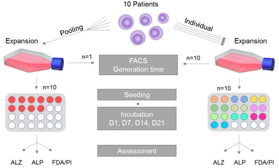 A schematic overview of the study is given in Figure 1. In short, MSCs are harvested from 10 patients and isolated following standardized and well-established protocols [5,26,27]. Cells of each patient in passage 1 were cultivated individually in addition to MSCs of all patients being pooled in equal parts in a single reaction tube and cultivated in the pooled setting. After expansion until passage 3, the generation time, the ability for trilineage differentiation as well as the MSC-specific surface characteristics were assessed during cultivation. After that, cells were subjected to osteogenic differentiation. The respective methods are explained in greater detail within the following paragraphs.