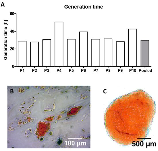 Generation time and characterization of donor cells as MSC. Generation time of 10 single patients (P1–P10) and pooled cells (A). Representative pictures of red-colored fatty vacuoles after adipogenic differentiation for the pooled group after Oilred-O staining (B) and orange staining indicating chondrogenic differentiation for the pooled group in Safranin-O/Fast Green staining (C).